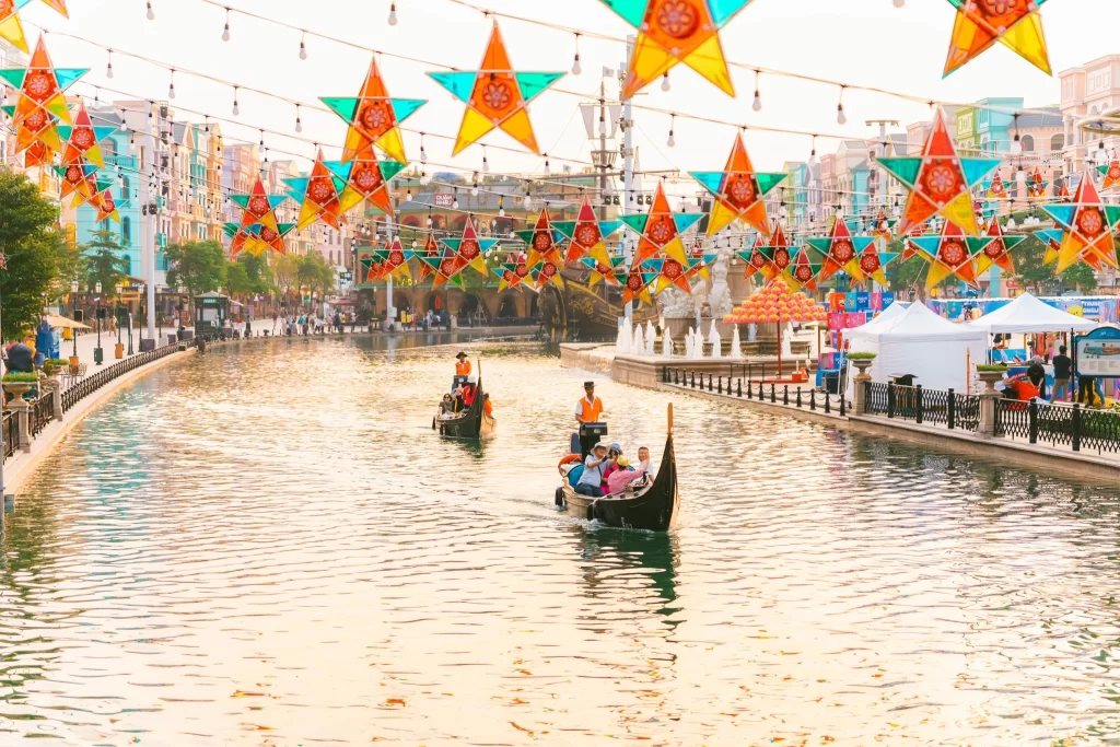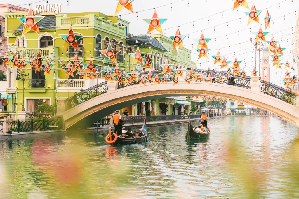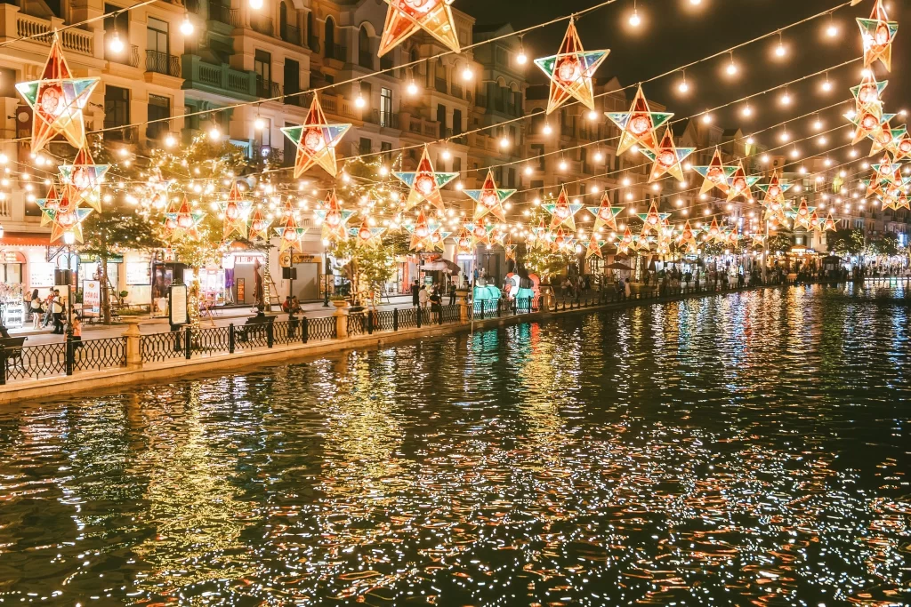 Dải đèn ông sao ven dòng Venice: Hàng ngàn chiếc đèn lung linh phản chiếu xuống dòng nước, tạo nên “dòng sông ánh sáng” giữa lòng phố hội, nơi mỗi bước đi đều ngập tràn cảm xúc.